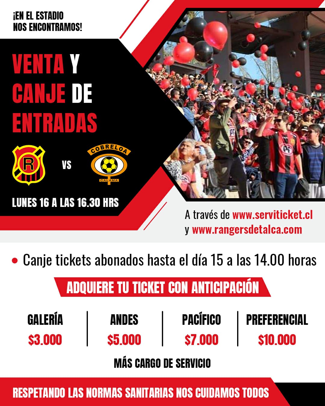 La venta de entradas y canje para abonados comenzará a partir de las 16:00 y podrán acceder a través de www.serviticket.cl y de www.rangersdetalca.com.