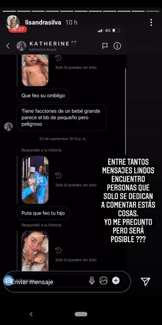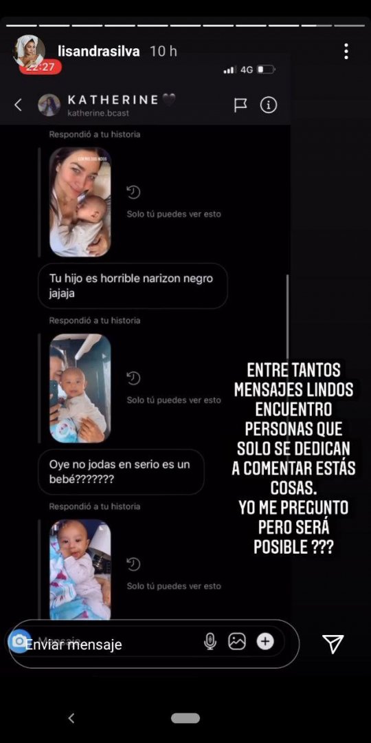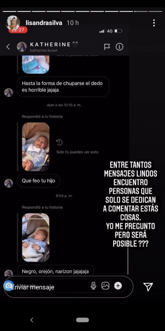 “Que feo tu hijo”, “Negro, orejón y narigón”, “Que feo su ombligo”, “Hasta la forma de chuparse el dedo es horrible”, son algunos de los mensajes que Silva expuso a través de sus historias de Instagram donde escribió: “Entre tantos mensajes lindos encuentro personas que solo se dedican a comentar estas cosas. Yo me pregunto pero ¿será posible?”.